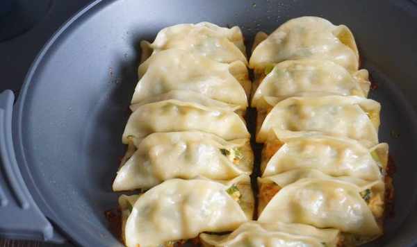 1、鍋貼前面的步驟我就不多說瞭,你可以簡單地理解為餃子不封口,在鍋中煎熟,做好之後金黃酥脆,與煎餃的口味差不多,但餡料會更足一些,焦黃的部分也是更多,更香。