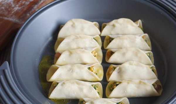 【所需食材】:餃子餡一碗,餃子皮適量,蔥花適量,食用油足量,水90g,面粉10g,小米辣,生抽醬油,醋,香油
