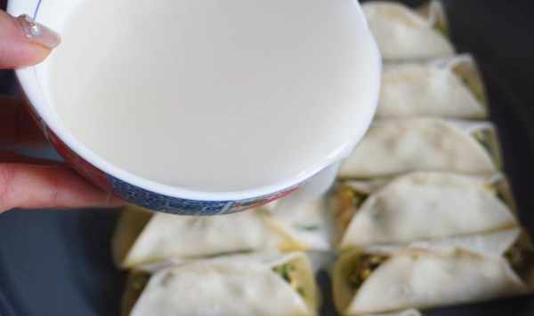 4、然後把準備好的面水倒在鍋裡面。不需要太多,也是和油一樣,在鍋底有薄薄的一層,稍微可以浸泡到鍋貼的餡料就可以瞭。