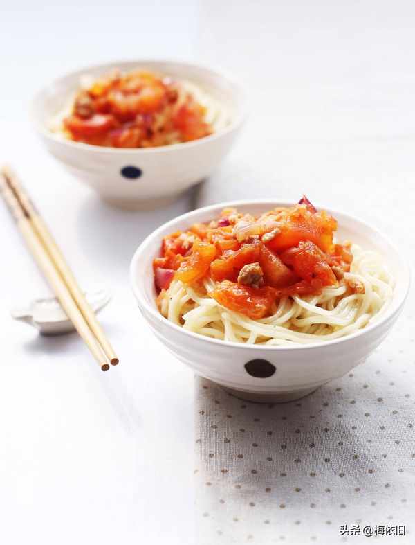 4. 放入西紅柿塊炒至黏稠,調入鹽、糖出鍋即可。面撈起後過水,將炒好的西紅柿醬拌面即可。