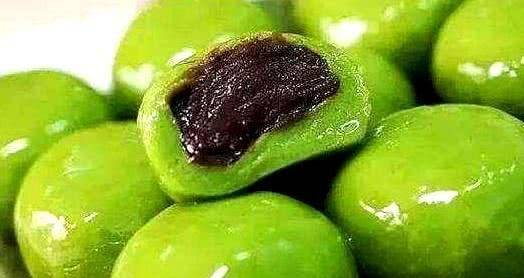 4、湯圓煮好後撈出放在案板上,鍋裡加一勺豬油,把剛剛過濾好的牧羊泥放在糯米面團上,揉勻,留著牧羊兜的原漿完全混合放入糯米粉中,面粉糯米可以染色。