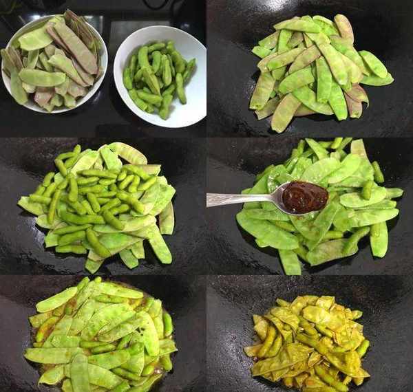 【做法】:毛豆剪去兩頭,清洗幹凈,眉豆擇去兩頭的豆莢絲清洗幹凈,鍋中倒入適量油,先把眉豆放入鍋中煸炒至眉豆變綠色後把毛豆一起放入鍋翻 炒,加入少許鹽和1勺黃豆辣醬炒勻後加入適量水,大火煮開後轉中小火燜煮至眉豆變軟,毛豆酥爛,湯汁濃稠收汁就可以關火瞭。
