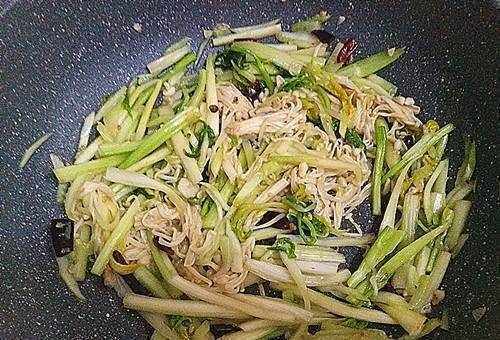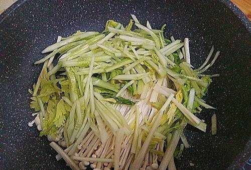 3、再加入切碎的黃瓜、藥明和金針菇,中火翻炒。