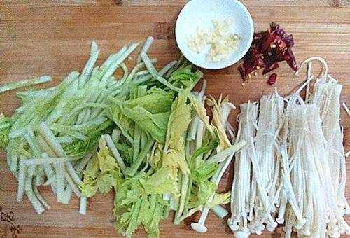 1.將一根軟黃瓜切成片,再切片。西芹也切丁,但不是葉子。金針菇洗凈撕成小塊。切碎大蒜。4條幹辣椒,切碎。