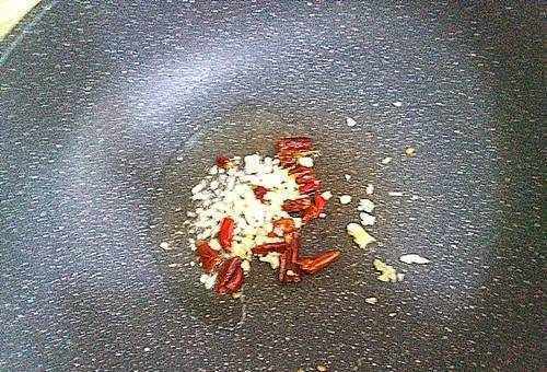 2.熱鍋冷油,加入蒜末和幹辣椒,用文火燒香。