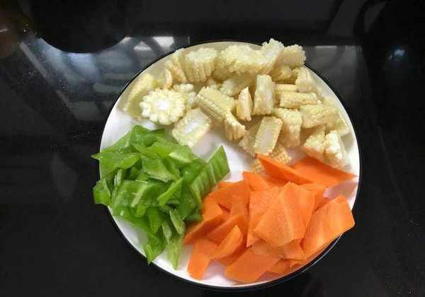 4、玉米筍清洗幹凈,切成小段,青椒去籽洗凈後切小塊,胡蘿卜去皮洗凈也切成小塊。