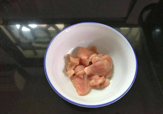 2、豬肉清洗幹凈切成薄片加入少許鹽,料酒和淀粉醃制10分鐘。