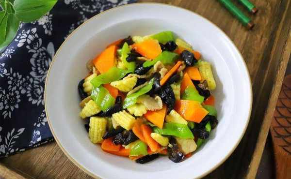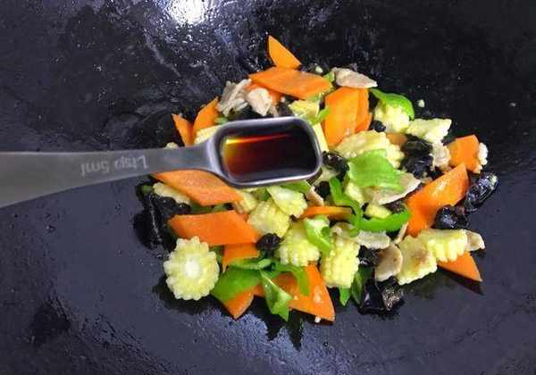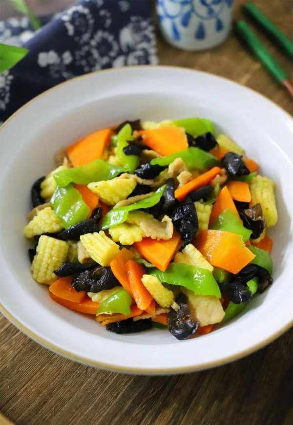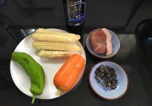 【材料】:玉米筍150克,青椒1個,胡蘿卜半根,豬肉80克,黑木耳1小把,鹽少許,輕鹽醬油1勺,油適量