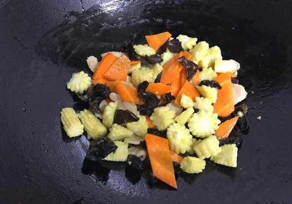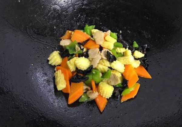 6、再分別放入玉米筍,黑木耳,胡蘿卜片和青椒片。