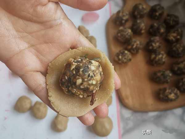 第六步:把一個小面劑子按扁,放上餡料,收口,團成圓球。