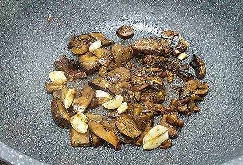3、熱鍋倒入少許油,加入蒜頭爆香,然後加入牛肝菌,中火翻炒。