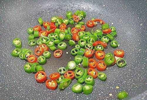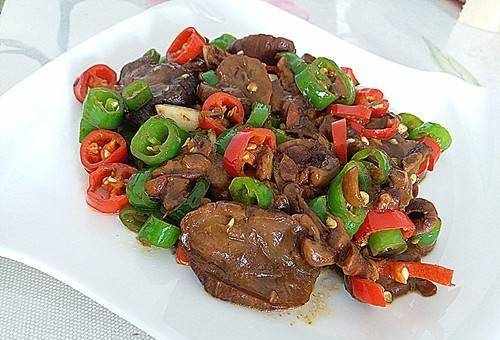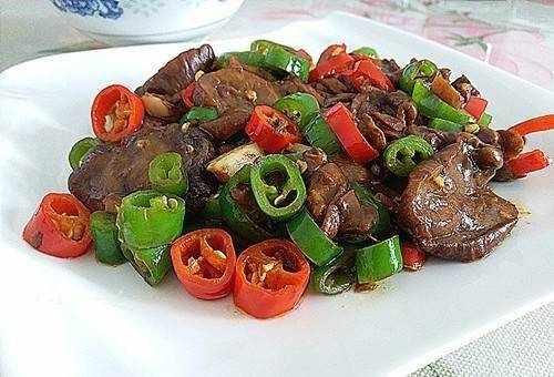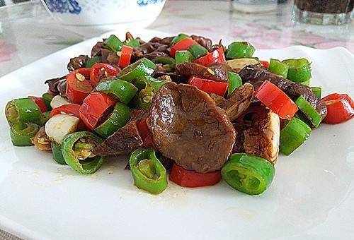 5、鍋內倒入適量的油,加入適量的鹽,放入切好的青紅椒炒香,再倒入炒好的牛肝菌,加少許味精,攪拌均勻,鋪好它在盤子裡。食用。