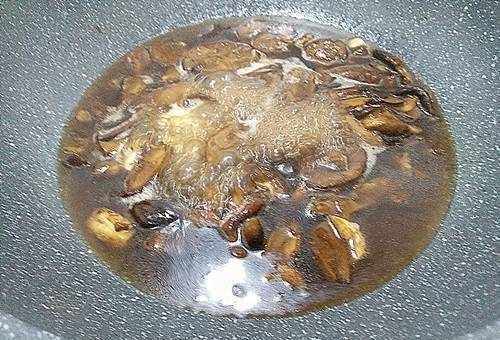 4、將牛肝菌炒香,加入適量開水,蓋上鍋蓋煮至湯汁收幹,撈出裝盤待用。
