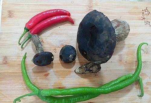1.野生牛肝菌3朵、青椒2條、紅椒2條。