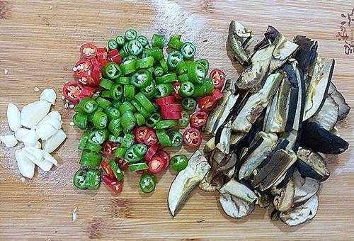2.將牛肝菌洗凈,切成小塊。將青椒切成小圈。4瓣壓碎的蒜瓣。