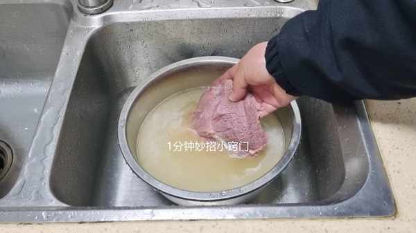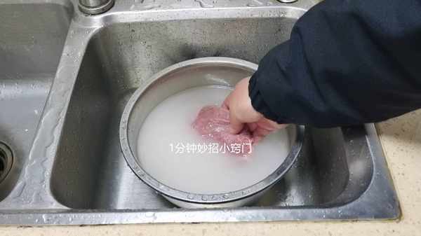 現在,我們把豬肉放到溶液裡面,搓洗一會,洗掉豬肉表面的一些雜質,臟東西,然後浸泡五分鐘左右,在浸泡的過程當中,還可以把豬肉裡面的一些血水給浸泡出來,因為血水,也是豬肉腥味的來源之一。