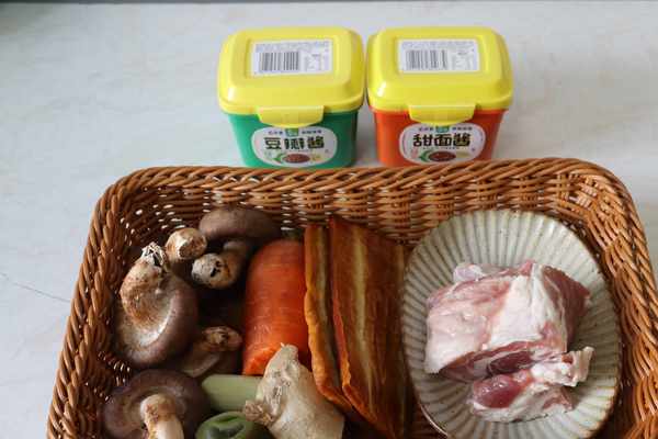 所需食材:豬肉:170克,豆幹:2片,胡蘿卜:半根,香菇:5個所需調味料:蔥薑:適量,料酒:半大勺,淀粉:半大勺,黑胡椒粉:1小勺,豆瓣醬:1大勺半,甜面醬:1大勺,白糖:半大勺