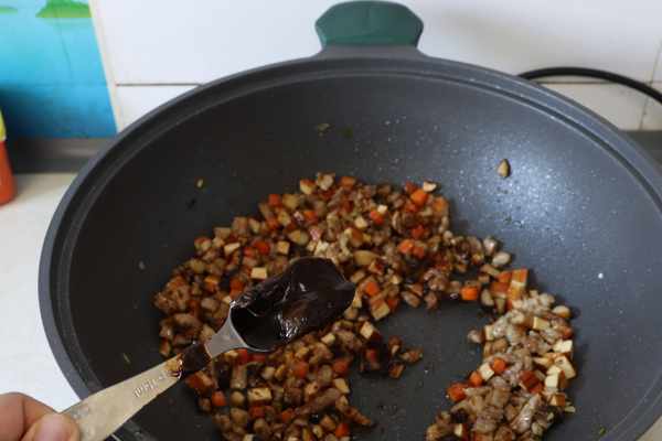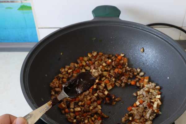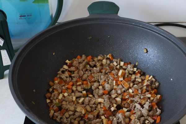 再放入胡蘿卜丁翻炒成熟,最後倒入豬肉丁和豆幹一起翻炒