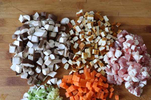 所需制作步驟;準備好所需要的食材並稱量好,豆幹,胡蘿卜,香菇,豬肉切丁,蔥薑切末備用
