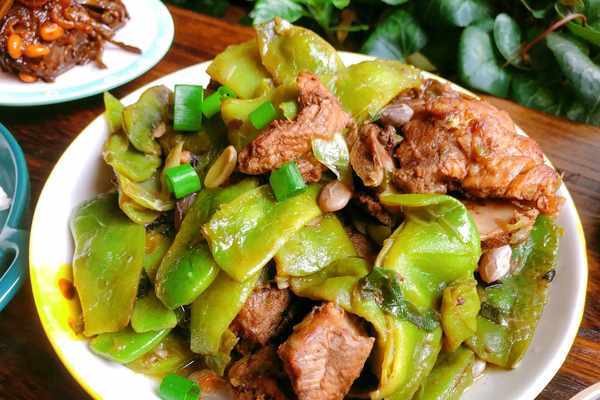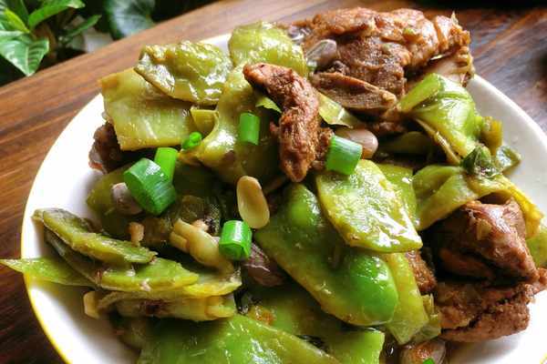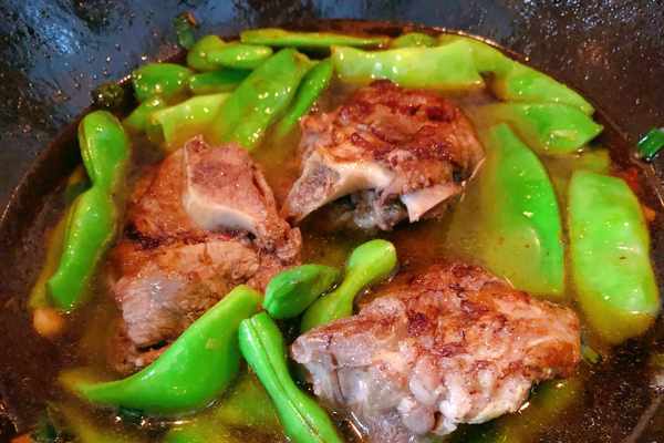 豆角炒至變色後,加入剛才煎熟的骨頭。