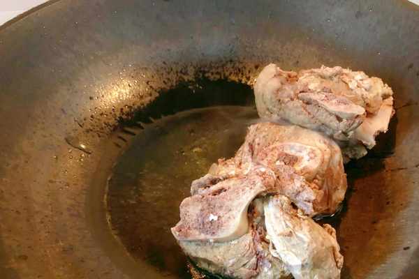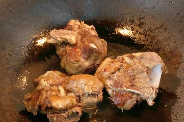 鍋中入油,油開,倒入骨頭。