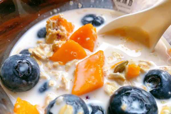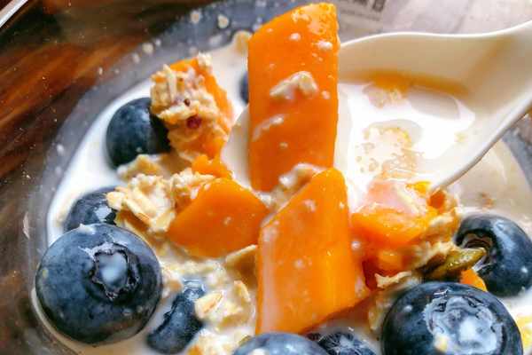 做飯的時候感覺特別口渴,於是就喝瞭半包牛奶,還剩瞭半包,就打起瞭芒果的主意,加瞭點藍莓和水果燕麥片,簡直太好喝瞭。