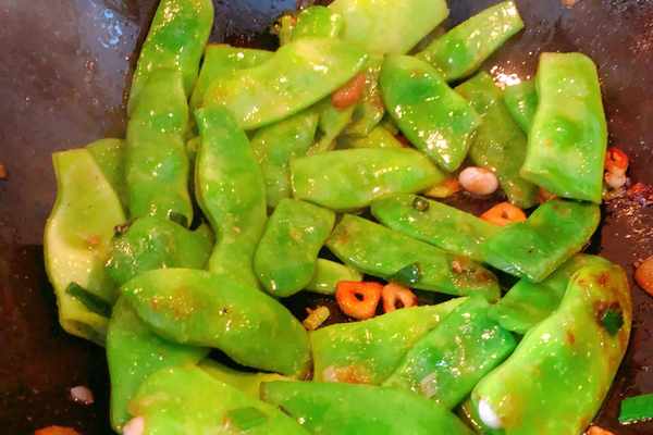 豆角炒至變色,炒成翠綠色,隨後加入食鹽,繼續翻炒。
