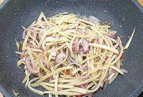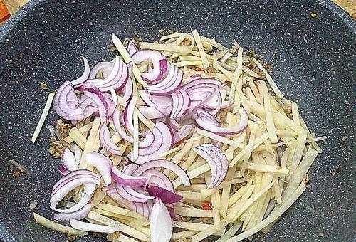 6、炒至洋蔥碎,加入適量鹽,炒勻後出鍋。