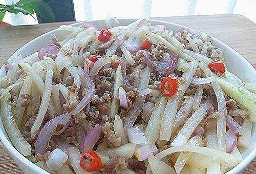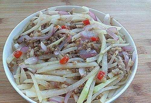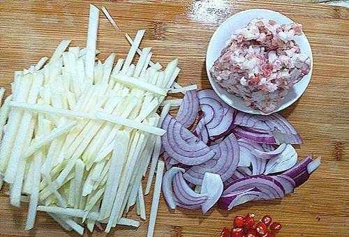 1.大頭菜1個去皮切片,洋蔥半個切碎佐菜,2粒辣小米切成小圓圈。五花肉去皮切碎。