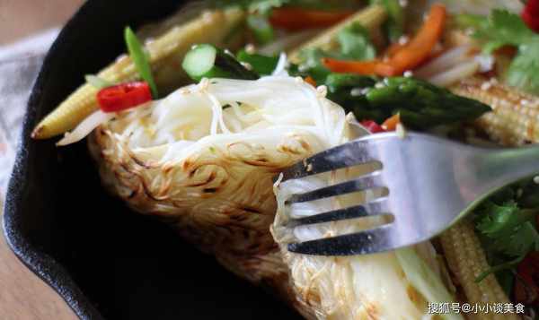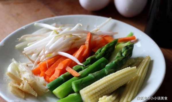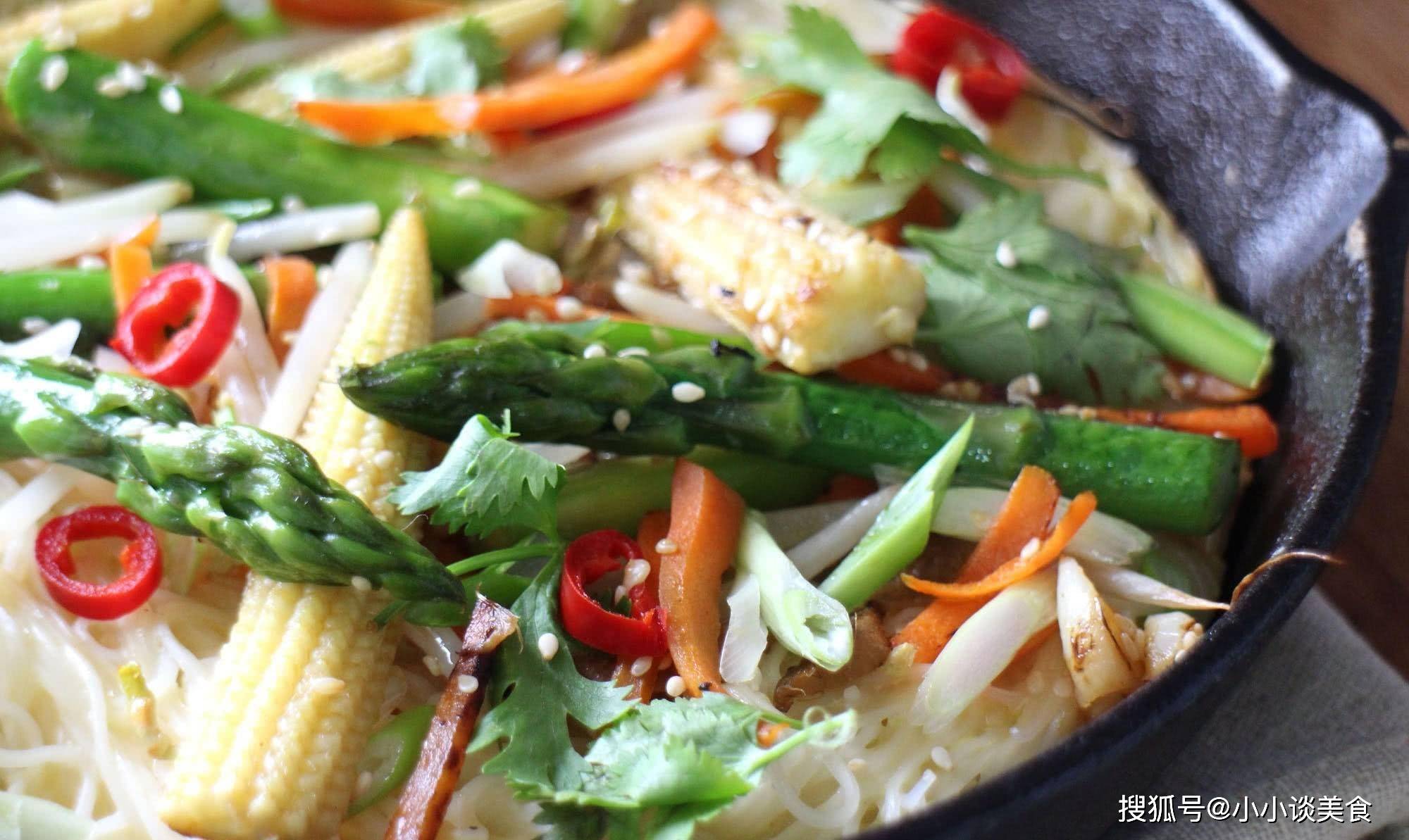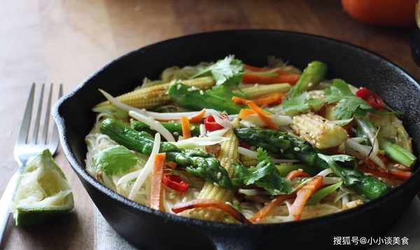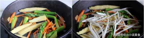 先用一茶匙香油炒薑和大蒜,然後加入文火煮熟的蘆筍、玉米和胡蘿卜,翻炒1分鐘,然後加入豆子和少許芝麻翻炒。直到它們不太軟,然後先把它們端出來。