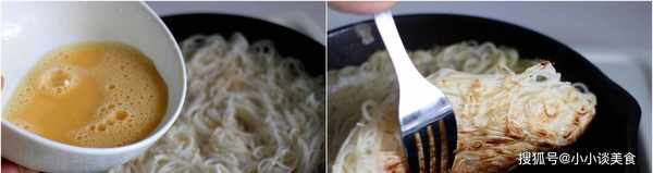 取下頂盤,撒上剩餘的芝麻,雞蛋打散加少許水,均勻淋在面條上,蓋上鍋蓋,轉小火煎幾分鐘至底部酥脆。