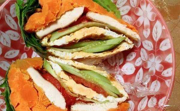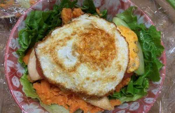 接下來,將炸好的雞胸肉放在紅薯泥上,依次加入番茄片、黃瓜片、雞蛋等材料。所有的食材都放好後,蓋上一片生菜葉,最後蓋住所有的食材。