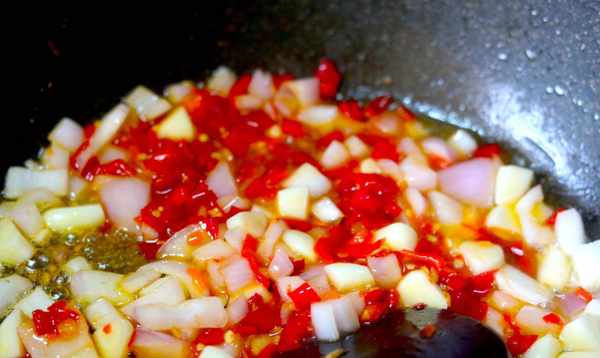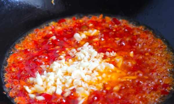 1、把剁椒取出來清洗幹凈,鍋中放入植物油,燒熱之後,放入剁椒開始炒,接著放入薑末蒜末。