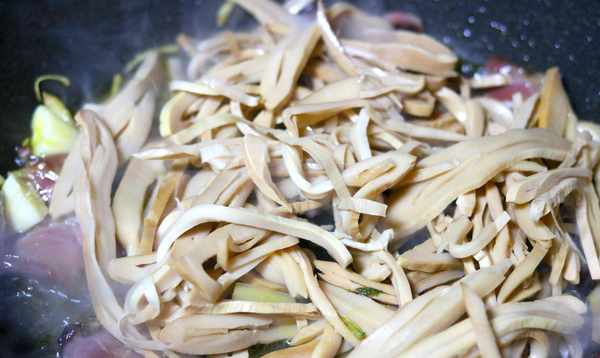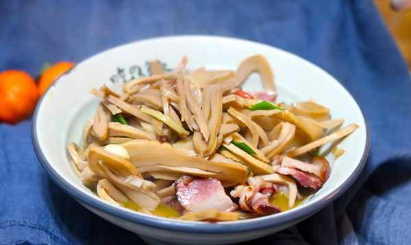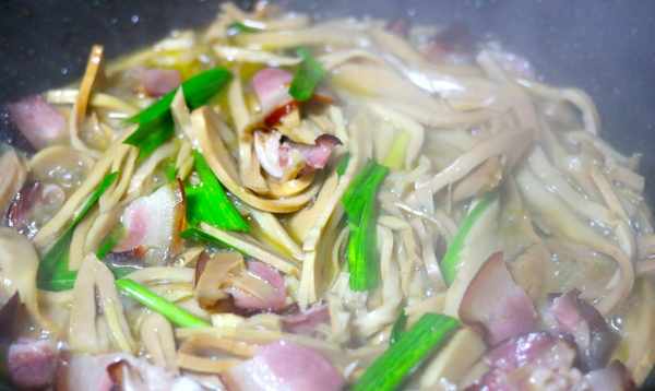 所需食材:臘肉、蒜片、薑、幹竹筍、植物油、高湯、雞粉