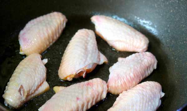 2、醃制好的雞翅取出來,鍋中放入少許的油,燒熱之後,放入醃制好的雞翅,開始煎,把它煎至金黃。