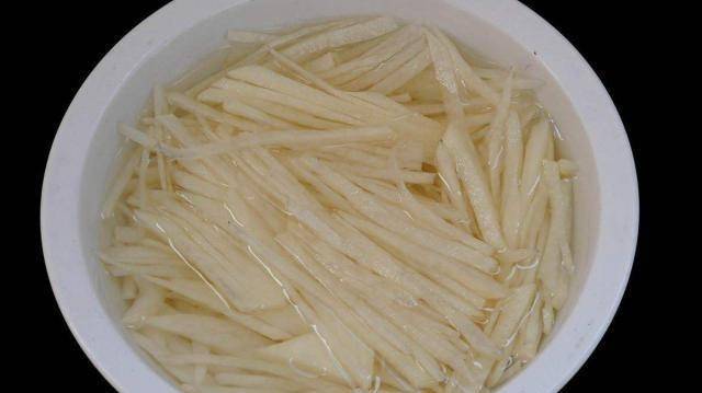 總之,這個土豆的磨碎方法和我們之前的炸土豆是不一樣的。我覺得這個方法更簡單實用,做出來的薯角更脆更爽口。值得註意的是,直接炒土豆絲是錯誤的。加醋分兩步:第一步是泡土豆的時候加白醋;土豆更香脆。