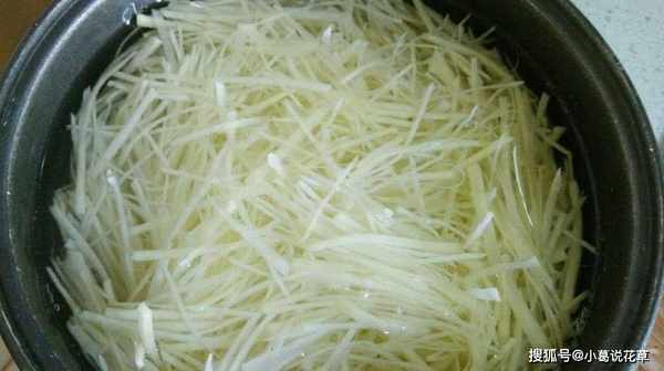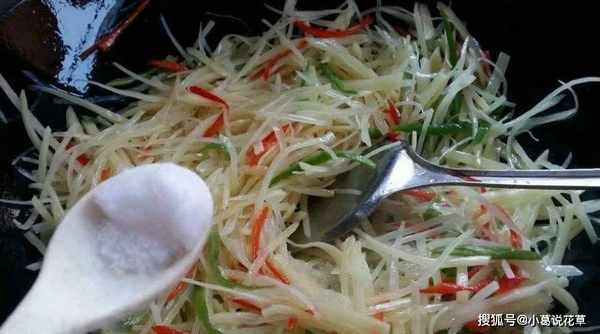 泡土豆泥時,除瞭水,還需要加入適量的鹽和香醋。浸泡幾分鐘後,就可以炒瞭。這樣,磨碎的土豆會更脆,不會粘鍋。炸出來的土豆片顏色會更漂亮,可以放點青紅椒一起炒,味道會更好,但是要記住土豆片不能泡太久。