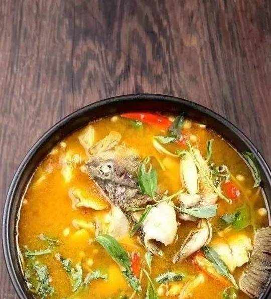 2、鍋留少許底油,爆香蒜片、薑片、香茅草、小米辣,加酸湯燒開,放入魚片、魚頭、魚尾、金針菇,大火燒開,出鍋裝入容器,點綴荊芥、大芫荽、熟番茄片即可。