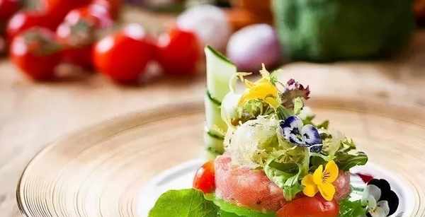 2、將鮮榨青蘋果汁、罐裝蘋果汁以2:1的比例混合,加入融化的魚膠片制成啫喱狀,放入盤中,放上金槍魚沙拉,點綴混合生菜、可食用花、迷你黃瓜、小番茄、黃瓜片,盤中點意大利濃縮黑香草醋、梅子汁即可。
