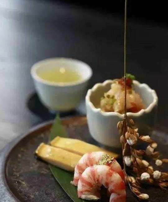大連鮑,北海道澳帶,基圍蝦,花生豆腐,桂花九曲紅梅,金箔,香蔥,XO醬,美極鮮,紹興醉糟,鹽,花椒,青芥辣。