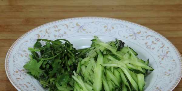 3、在加入調料之餘,我們還要準備一些配菜,既可以點綴涼拌面的成色,補足拌面的營養。準備一根黃瓜,清洗幹凈後,將黃瓜切成細絲,裝盤備用,然後取適量的香菜切成小段,裝盤備用。