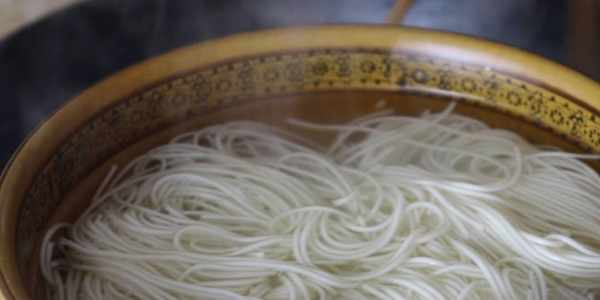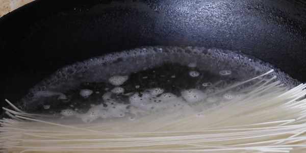 2、在鍋裡的水第一次開鍋時,我們要向鍋中淋入一些涼水,這樣可以讓面條受熱更加均勻。