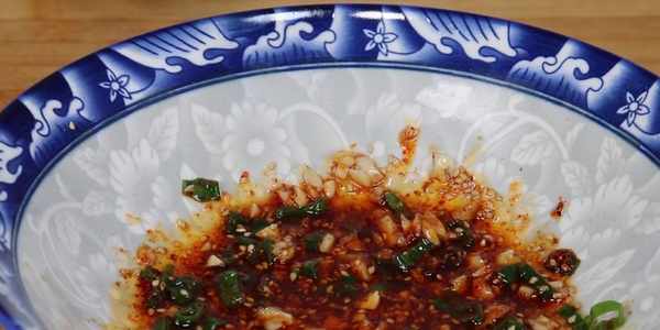2、接下來,我們要開始調制拌面用的料汁。向剛才裝著蔥和蒜的碗中加入適量的芝麻,辣椒面,花椒粉,澆上熱油,爆香;然後我們還需要加入一些調味的調料,向碗裡放點食鹽,白糖,生抽,陳醋,香油,然後攪拌均勻,這樣,我們的調料碗就制作完成瞭。