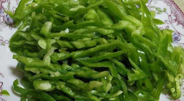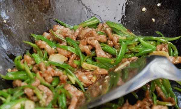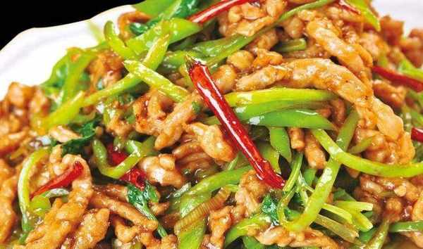 鍋裡放適量的油,油盡量多放,然後把醃制好的肉絲倒入鍋中煮至變色,撈出。瘦肉不能煮太久,否則肉會變質。鍋內留油,下薑、蒜、幹辣椒炒香,再下青椒末炒至生,下入炸好的肉絲。