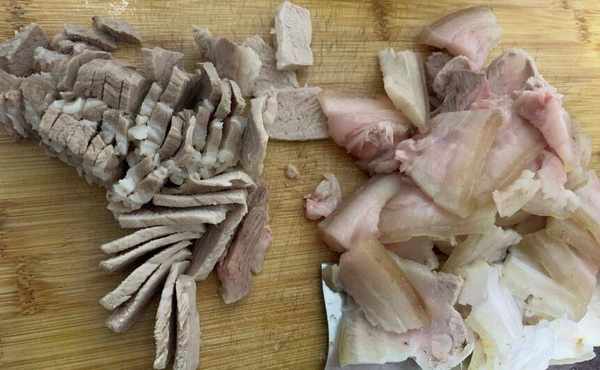 下一步是將煮熟的豬肉切成薄片。最好把肥肉分開切片,這樣可以把肥肉和肥肉一起炒,這樣二次煮出來的豬肉就不肥瞭,油也可以用來炒菜。