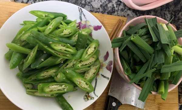 在煮豬肉的同時,您可以準備這道菜。回鍋肉常用的配菜有辣椒和蒜苗。也可以用咸菜,但是蒜苗可以讓豬肉回鍋味。配菜做好後,洗幹凈再切塊備用。