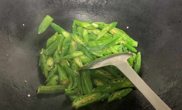 然後再將青椒炒熟,鍋中加入適量的油,將青椒放入鍋中炒至生,加少許鹽,即可出鍋。