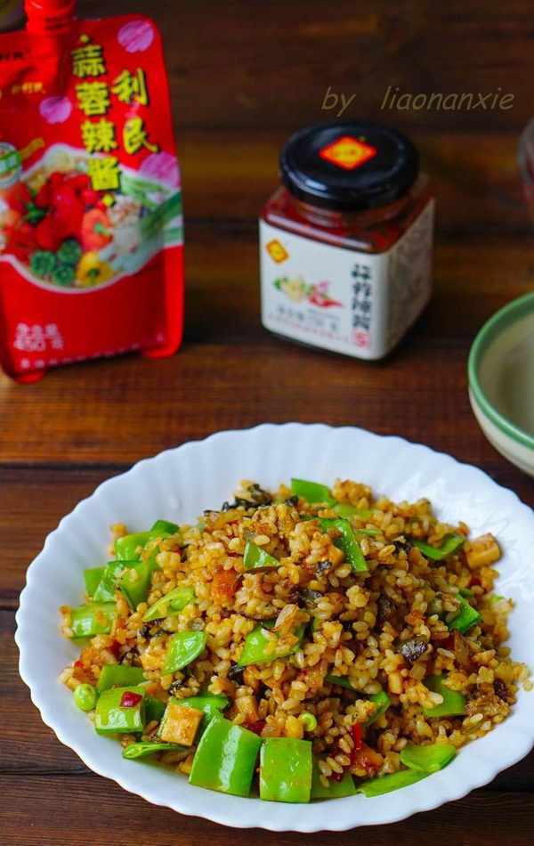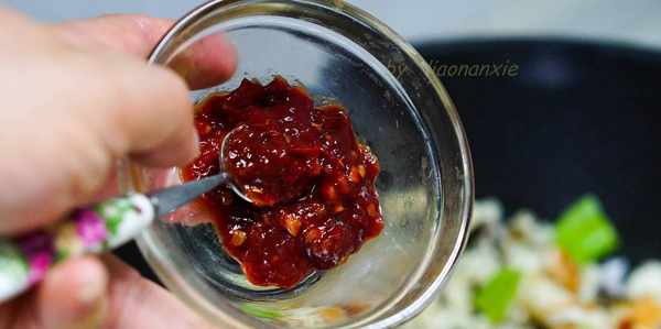 準備利民蒜蓉辣醬,利民牌調料是天津當地的老牌子,咸中帶著一點兒酸,微辣中還有黃豆醬的香味,炒飯的時候加兩勺,可以起到畫龍點睛的作用,非常好吃。