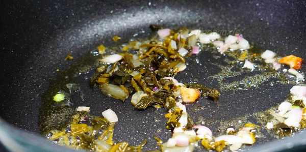 炒鍋倒油,先下洋蔥碎和酸菜碎炒香。