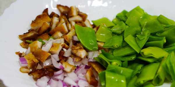 洋蔥切碎,酸菜切碎,雞肉切碎備用,荷蘭豆收拾幹凈之後也切成段。